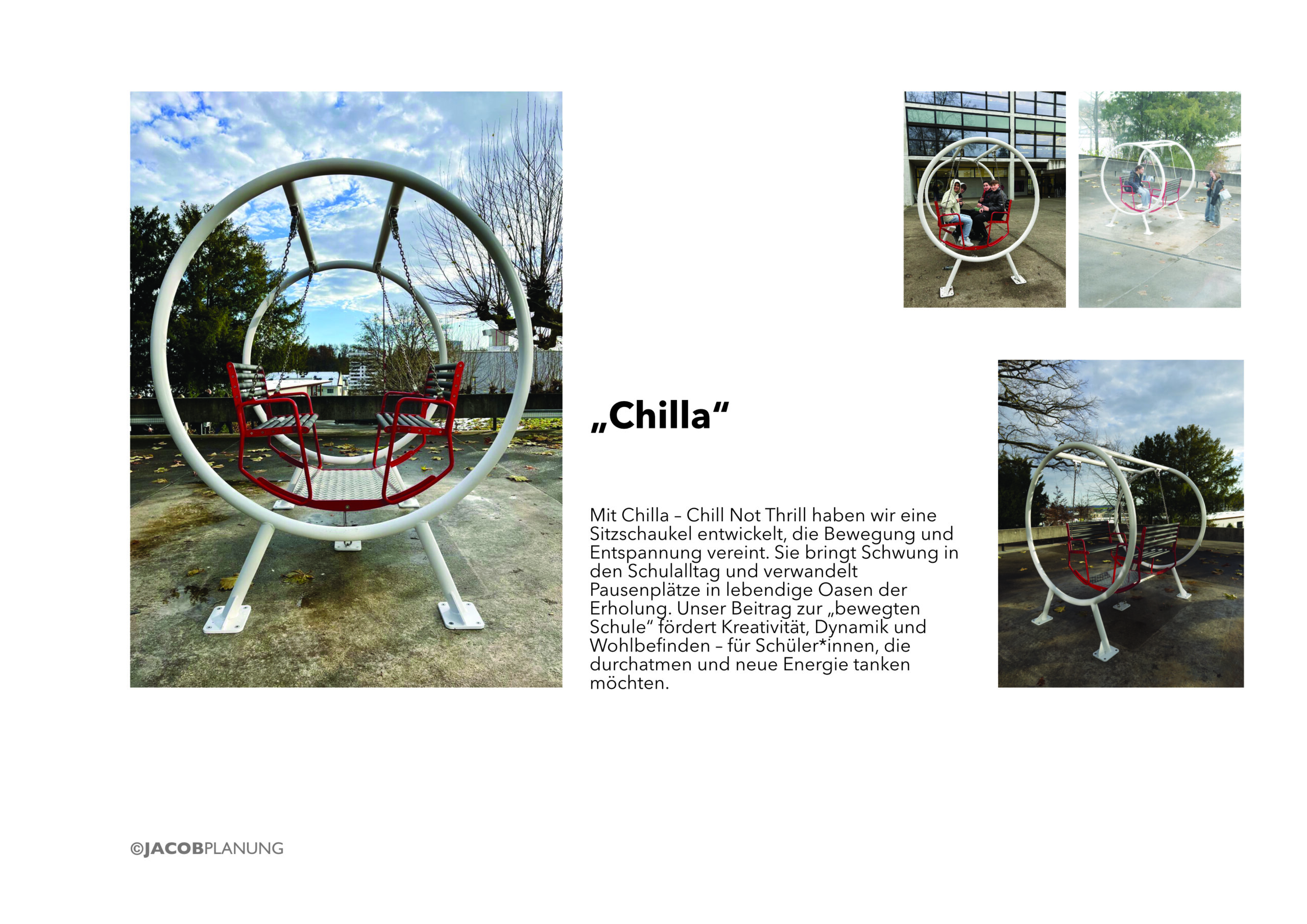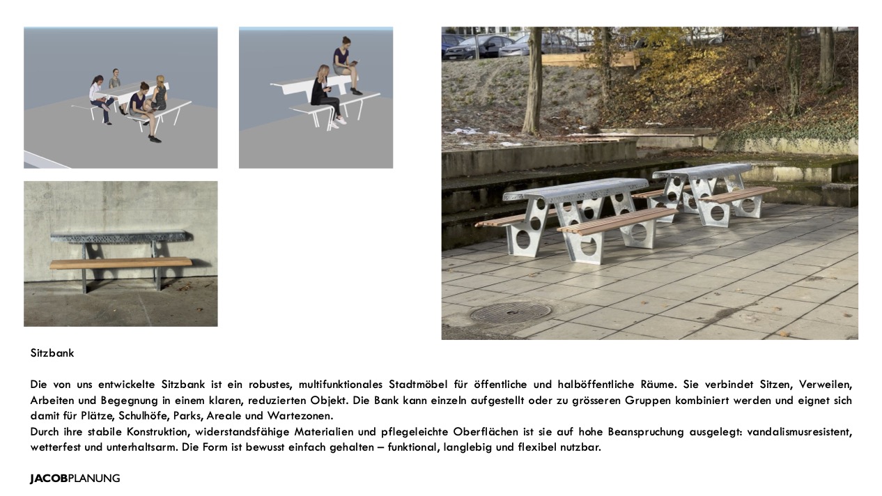 Für die «Bewegte Schule» konnten wir eine Sitzbank und eine Sitzschaukel entwickeln. Sie sind nicht nur Möblierung, sondern identitätsstiftende Elemente zwischen Spiel, Begegnung und Ruhe. Wo möglich wurden vorhandene Materialien wiederverwendet; das Projekt verbindet gestalterische Präzision mit pragmatischer Ressourcenschonung.